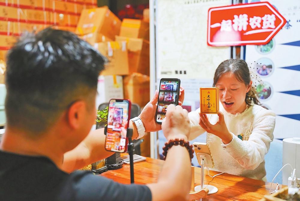 “歡迎各位茶友來到直播間,優(yōu)惠活動正式開啟,今天是‘景邁大樹茶’專場?!毖巯率莻鹘y(tǒng)茶葉銷售的淡季,而西雙版納傣族自治州勐??h拼多多商家李玉萍的直播倉庫內(nèi),卻是一派熱鬧景象。她和丈夫劉國威一邊向大家介紹茶葉產(chǎn)品,一邊端著茶杯對著鏡頭展示。剛剛報名拼多多24天“超級農(nóng)貨節(jié)”的他們,正在嫻熟地通過平臺直播間向各地網(wǎng)友介紹云南的普洱茶產(chǎn)品。