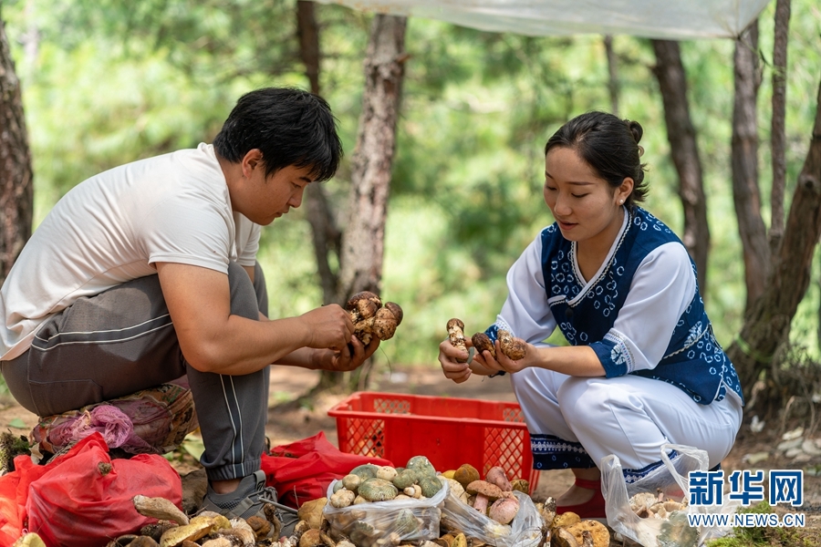 萬鈴(右)在挑選野生菌(攝于8月23日)。新華網(wǎng)發(fā)(羅新才 攝)