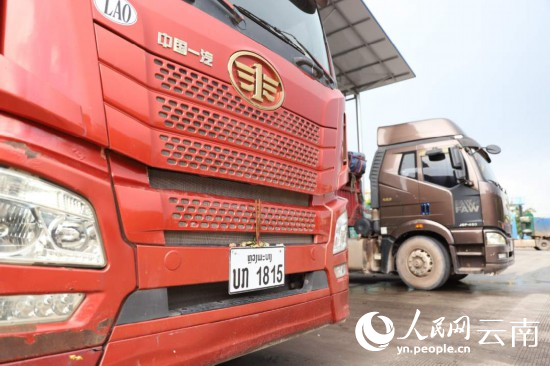 在磨憨鎮(zhèn),隨處可見(jiàn)國(guó)際貨運(yùn)卡車。人民網(wǎng)記者李發(fā)興/攝