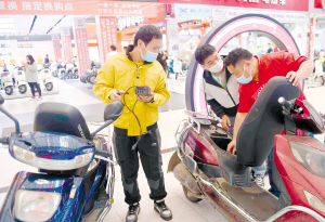 車主在珥季路指定換購點(diǎn)咨詢電動自行車以舊換新相關(guān)事宜。記者趙偉攝