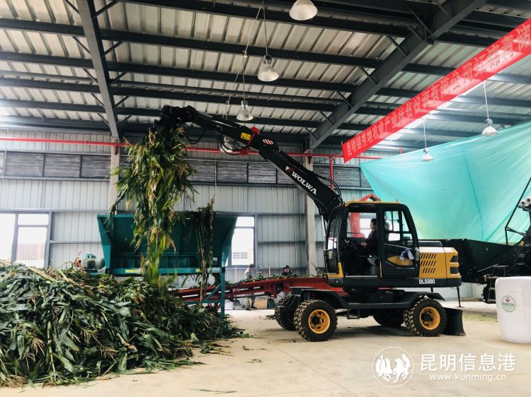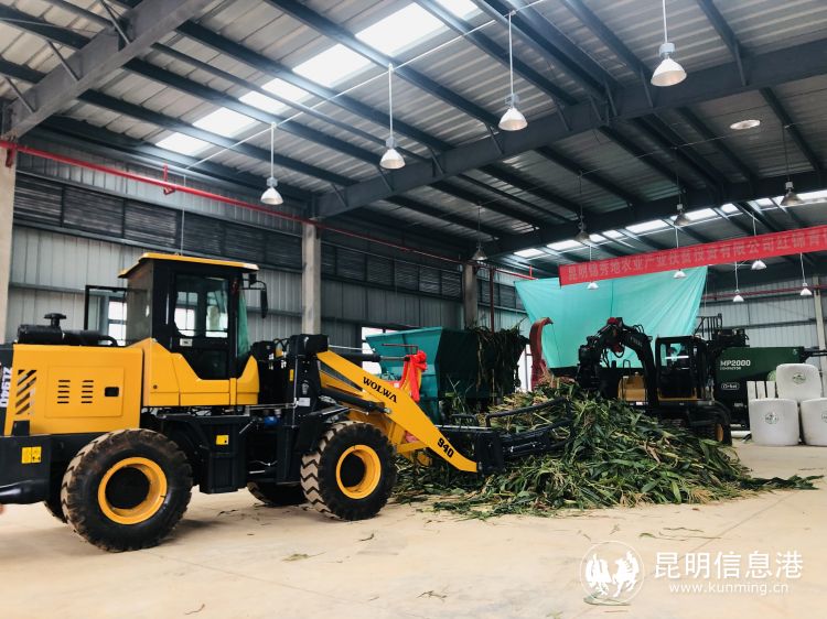 投產(chǎn)儀式結(jié)束后,當(dāng)?shù)剞r(nóng)戶就將地里尚未完全成熟的玉米砍倒,放置在三輪車上,或一人一車,或兩人一組,將玉米拉到飼料廠進(jìn)行青儲飼料生產(chǎn),有的村民因?yàn)槔奶?,?dǎo)致車子拋錨,在路邊堵起了一個小小的運(yùn)料隊(duì)伍。廠房工人將玉米卸下后,放入分料機(jī),將玉米桿均勻切斷,通過傳送帶送至粉碎機(jī),粉碎完成后,通過機(jī)器加入營養(yǎng)劑,最后送入裹包機(jī)進(jìn)行打包,一包一噸重的青儲飼料就生產(chǎn)完成了。后續(xù)這些青儲飼料包將銷往東川、紅河、曲靖等地的牧場。