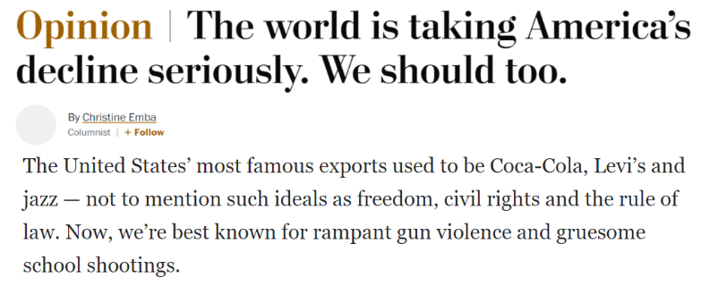 《華盛頓郵報》發(fā)表題為《世界正在認真對待美國的衰落 我們也應(yīng)該》的評論文章