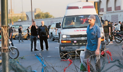 圖為8月29日,在伊拉克首都巴格達,救護車駛?cè)搿熬G區(qū)”。