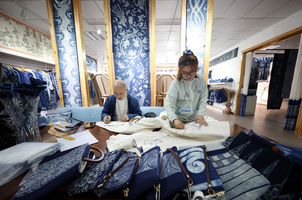 2022年4月7日,在貴州省黔東南苗族侗族自治州丹寨縣寧航蠟染非遺工坊,服飾設(shè)計(jì)師在設(shè)計(jì)蠟染產(chǎn)品。 新華社發(fā)(黃曉海 攝)