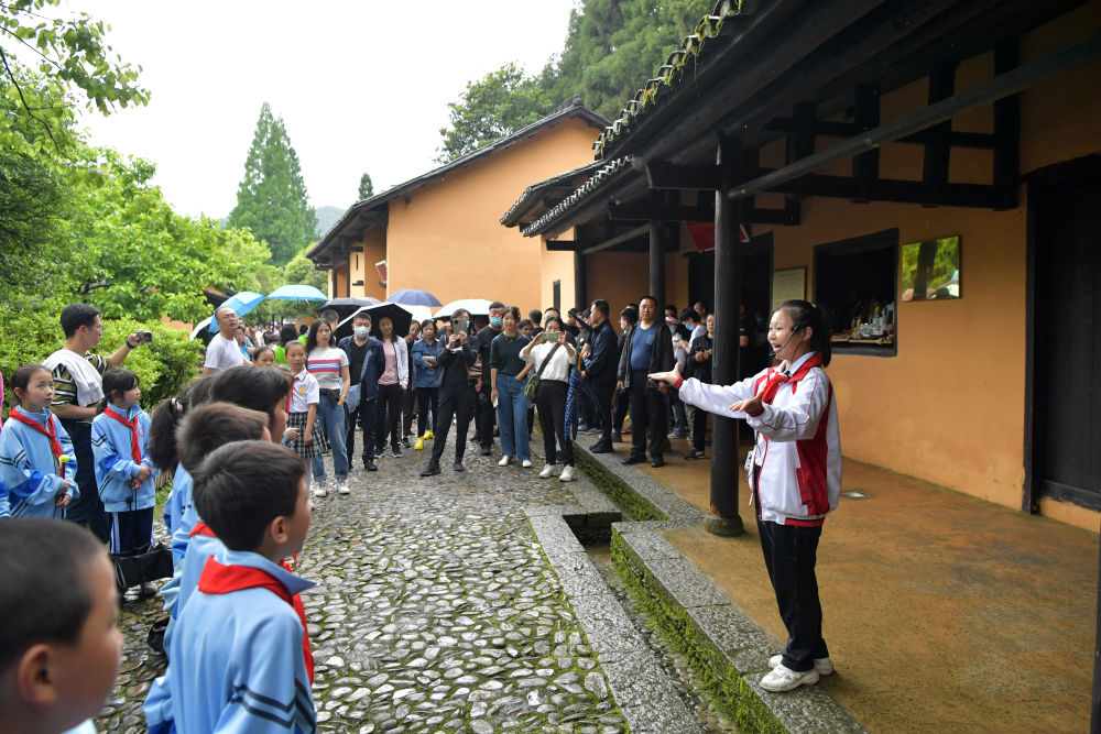 2021年5月11日,在江西省井岡山茨坪毛澤東同志舊居,“小紅軍宣講團(tuán)”的團(tuán)長(zhǎng)余梓洋給前來參觀研學(xué)的學(xué)生們進(jìn)行義務(wù)講解。新華社記者 彭昭之 攝