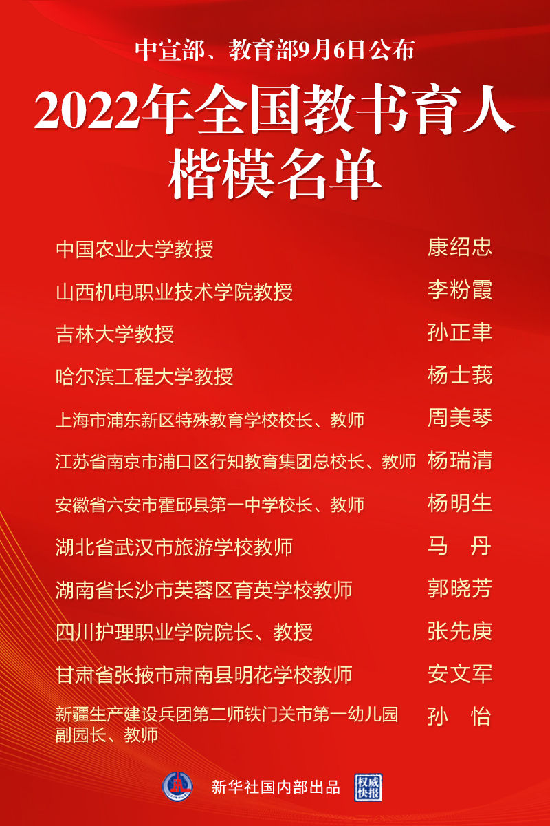 中宣部、教育部9月6日公布2022年全國(guó)教書育人楷模名單