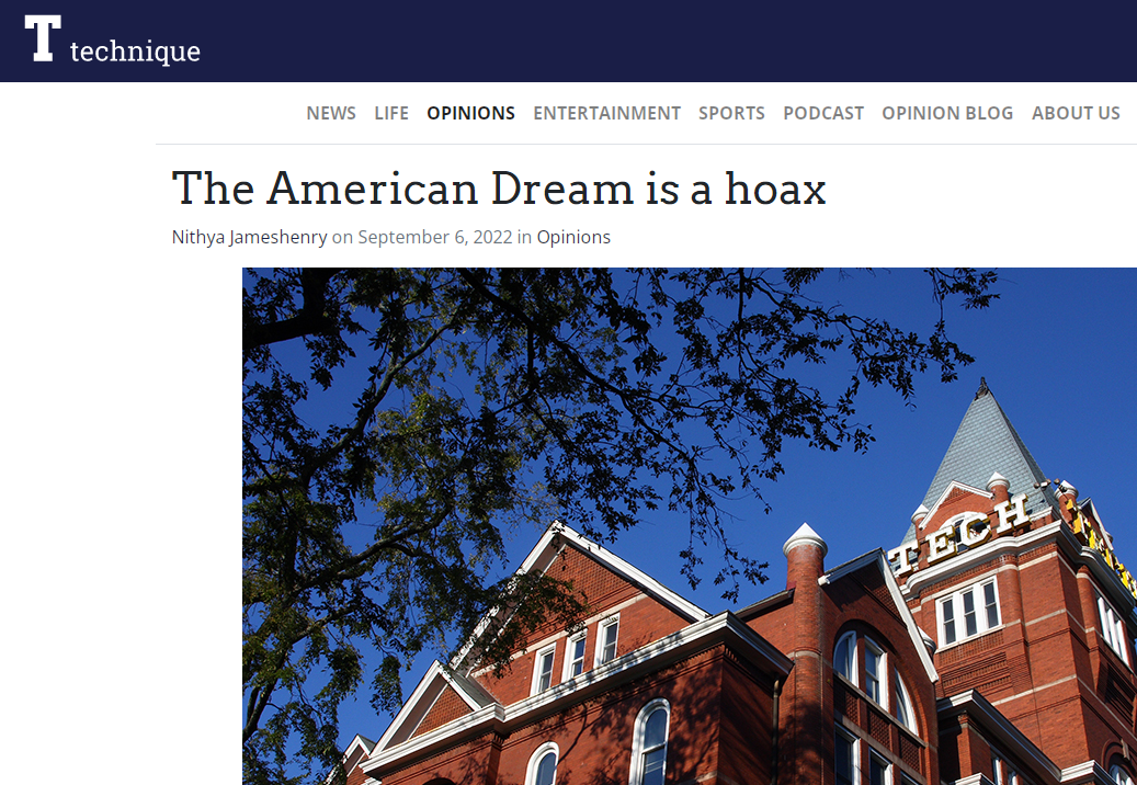 6日,美國(guó)喬治亞理工學(xué)院研究員尼提亞·賈梅舍里在校報(bào)《技術(shù)》網(wǎng)站上發(fā)表文章,揭穿“美國(guó)夢(mèng)”的真相——就是一場(chǎng)騙局。