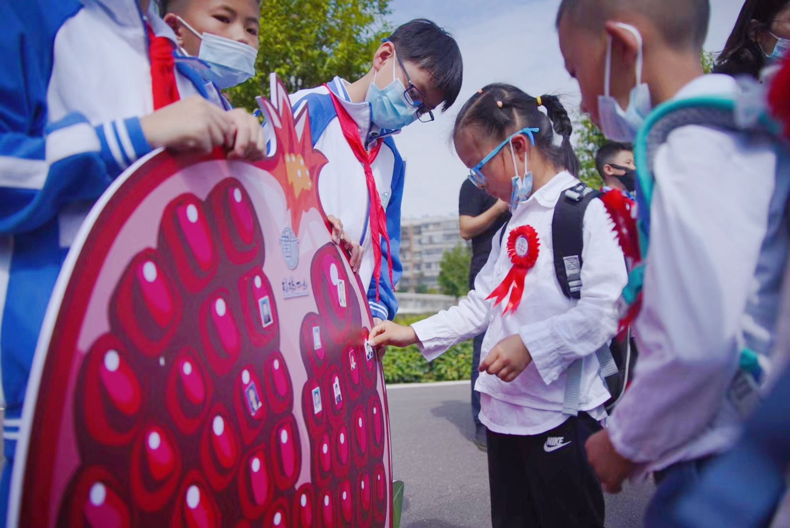 學(xué)校為使同學(xué)們快速融入新的班級(jí),特別在儀式上設(shè)置了“成為小石榴籽”的環(huán)節(jié)。微微石榴籽,顆顆團(tuán)結(jié)心,它象征著團(tuán)結(jié)一致,親如一家。一年級(jí)新生的到來(lái),也正如一顆顆小小的“石榴籽”,團(tuán)聚在書(shū)林一小這顆“大石榴”里。同學(xué)們?cè)诟髯园嗉?jí)的“小石榴”里,貼上自己的小照片,象征著自己以后就成為了和大家緊緊團(tuán)結(jié)在一起的“小石榴籽”。