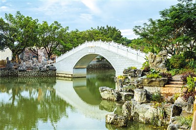 通往湖心島“鵲橋”的入口是極富嶺南韻味的“石竹林”?!俺鯓O狹,才通人。復(fù)行數(shù)十步,豁然開朗”。鵲橋就在這樣一片自然的石林之中。石竹林的石頭采用本地英石,大塊峰石獨立成景,再搭配31種不同類型的“竹”,在橋頭形成一個極致的“石竹林”景觀。
