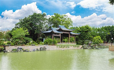 沙步是歷代司衙所在地,古運河鹿步滘是海上絲綢之路的起點之一,距今已有900多年歷史。河道的開拓極大程度便利了來往商船,使它們得以規(guī)避獅子洋的巨浪風(fēng)險。鹿步滘又叫扶胥古運河,韓愈對扶胥港有“扶胥之口,黃木之灣”的描述。港口的看海亭三面環(huán)水,正對浩瀚珠江,黎明登臨,可見日出奇景?!盎鹪埔粺?,天海皆赤”,曾讓遭貶的蘇軾頓生“坐看旸谷浮金暈,遙想錢塘涌雪山”的感慨?!胺鲴阍∪铡庇纱顺蔀樗卧獌纱把虺前司啊敝?。海絲文化墻以大紀(jì)事碑的形式,將開挖古運河、開辟海上絲綢之路的故事以文字及地圖的方式予以呈現(xiàn),凸顯出扶胥港口重要的地位。