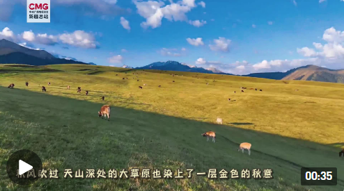 秋風(fēng)吹過(guò),新疆天山深處的大草原也染上了一層秋意,深綠與鵝黃交織的草原高低起伏,羊肥馬壯,猶如一幅流動(dòng)的金色畫卷。