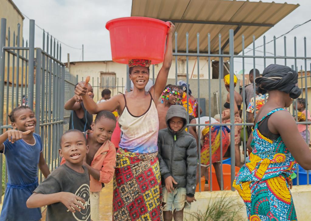 2022年5月31日,安哥拉卡賓達(dá)省日卡村,供水項(xiàng)目試運(yùn)行期間,當(dāng)?shù)厝巳⊥晁鬄榘仓袃蓢?guó)建設(shè)者們點(diǎn)贊。(中國(guó)鐵建二十局集團(tuán)供圖)
