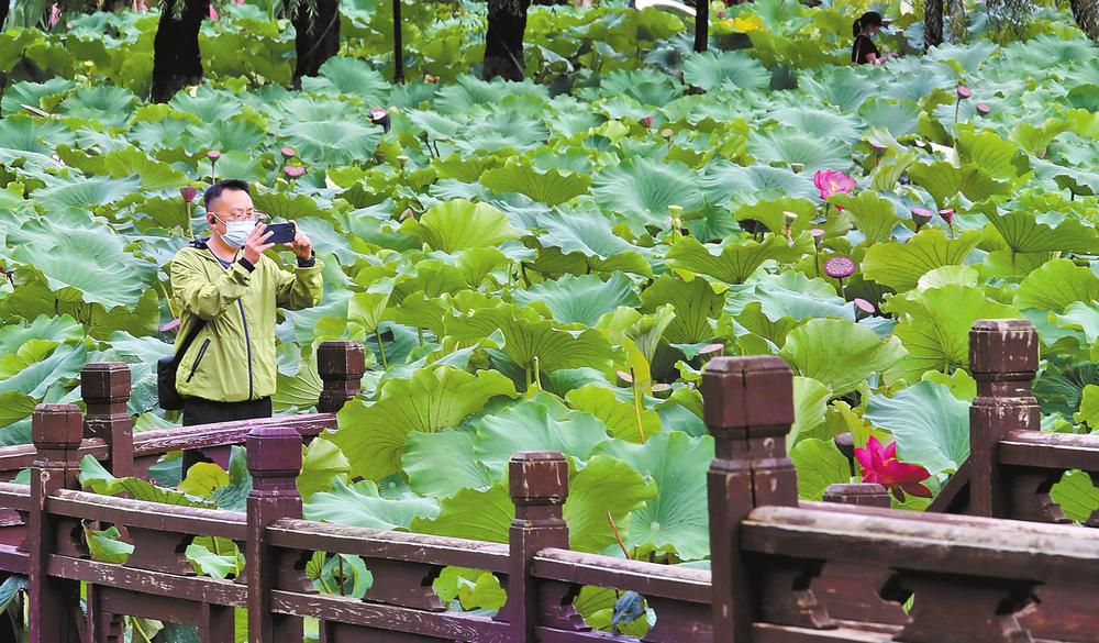 中秋節(jié)期間,春城市民積極防疫戰(zhàn)疫,少遠(yuǎn)行、就近游,公園里度假日。圖為昆明大觀公園荷花池等景致吸引市民前來參觀拍照。云南日報(bào) 記者 楊崢 攝