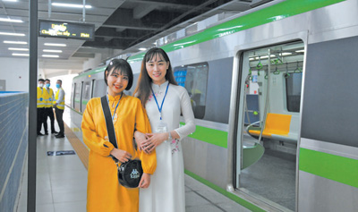 中企承建的越南首條城市輕軌投入運(yùn)行。圖為兩名乘客在輕軌列車前留影。