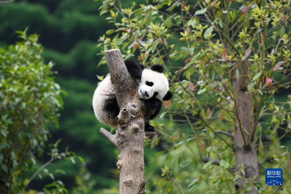 在中國大熊貓保護(hù)研究中心臥龍神樹坪基地內(nèi),一只大熊貓?jiān)跇渖闲菹ⅲ?022年4月24日攝)。 新華社記者 胥冰潔 攝