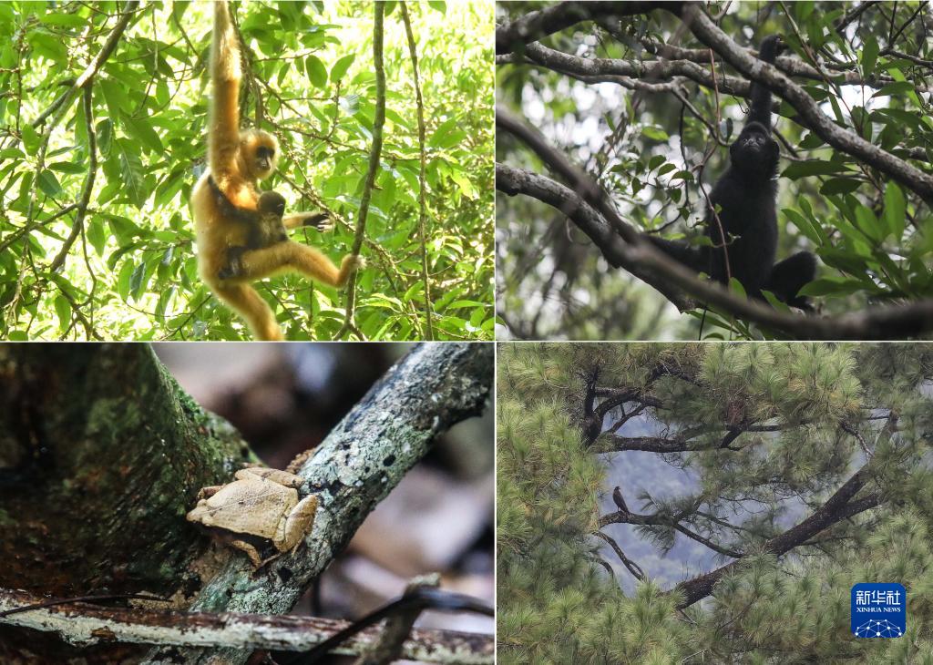 拼版照片:左上圖為2021年5月拍攝的海南長臂猿B群幼猿(海南熱帶雨林國家公園管理局供圖);右上圖為在海南熱帶雨林國家公園體制試點(diǎn)區(qū)霸王嶺自然保護(hù)區(qū)內(nèi)拍攝的海南長臂猿(2019年10月25日新華社記者蒲曉旭攝);左下圖為在霸王嶺自然保護(hù)區(qū)內(nèi)拍攝的姬蛙(2019年10月26日新華社記者蒲曉旭攝);右下圖為在霸王嶺自然保護(hù)區(qū)內(nèi)拍攝的蛇雕(2019年10月26日新華社記者蒲曉旭攝)。 新華社發(fā)