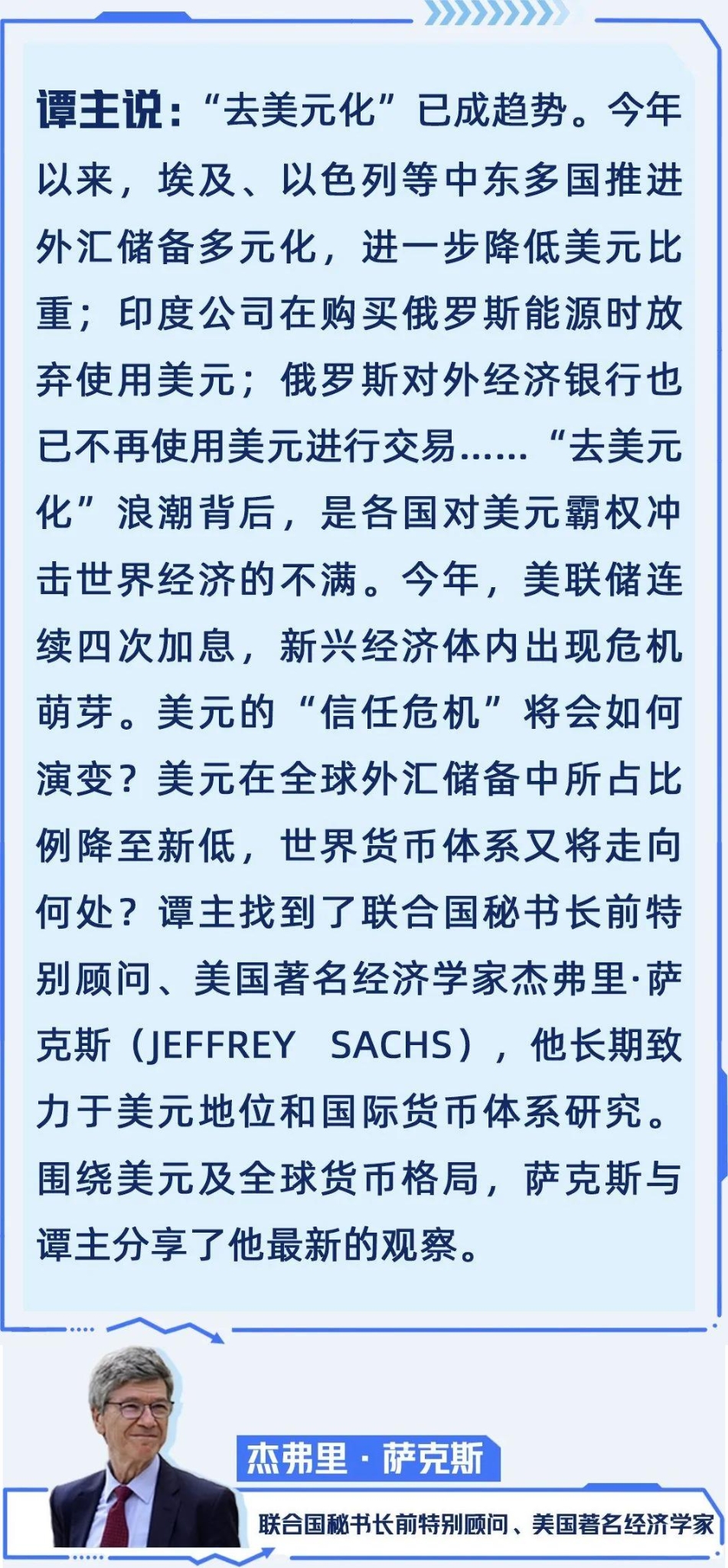 杰弗里·薩克斯:毫無疑問的是,我們正在向多元化貨幣體系邁進(jìn)。當(dāng)然,這是由許多因素造成的。