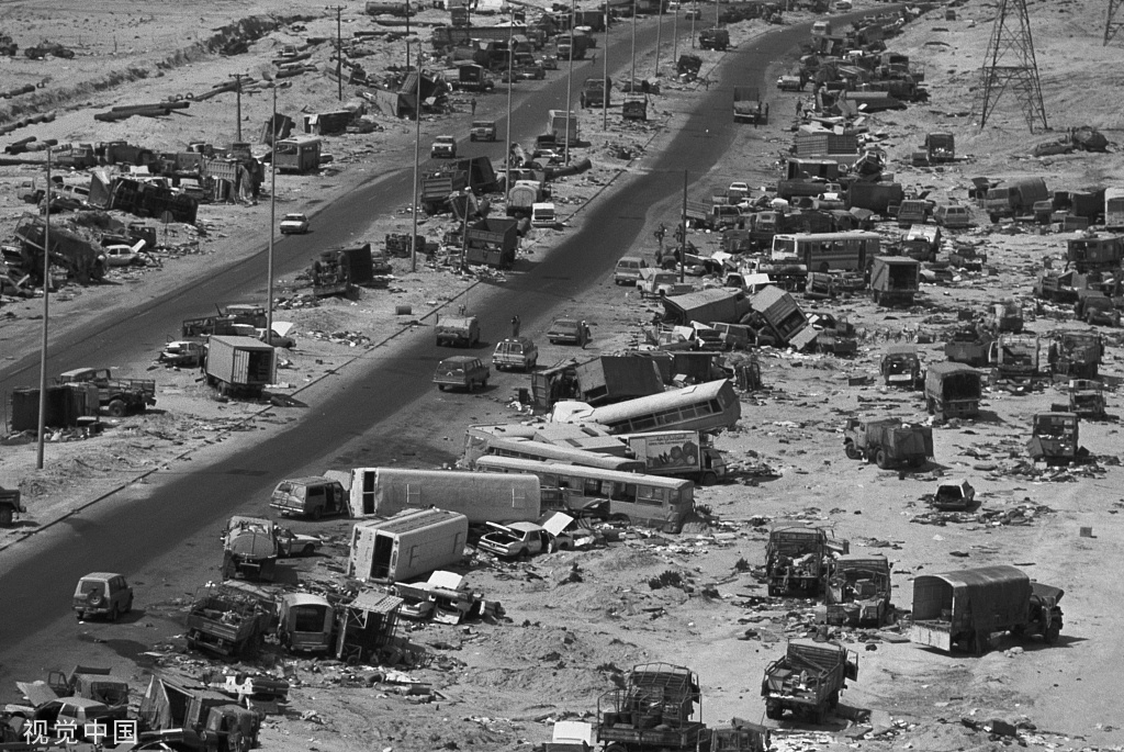1991年2月26日,根據(jù)聯(lián)合國(guó)決議,伊拉克軍隊(duì)從科威特撤退。然而,當(dāng)他們的車隊(duì)在80號(hào)公路上行進(jìn),美軍卻突然出手:集束炸彈、500磅炸彈、燃燒彈如雨點(diǎn)般落下,軍人與平民無(wú)差別地受到攻擊。(視覺(jué)中國(guó))