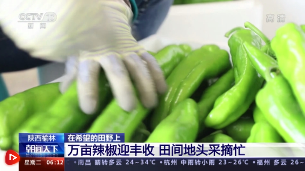 央視網(wǎng)消息:在陜西榆林定邊縣,6.5萬(wàn)畝辣椒陸續(xù)進(jìn)入采收季。在種植基地里,細(xì)長(zhǎng)的線椒、胖胖的圓椒、紅綠相間的尖椒長(zhǎng)勢(shì)喜人。村民們?cè)诨乩飦?lái)回穿梭,忙著采收辣椒。
