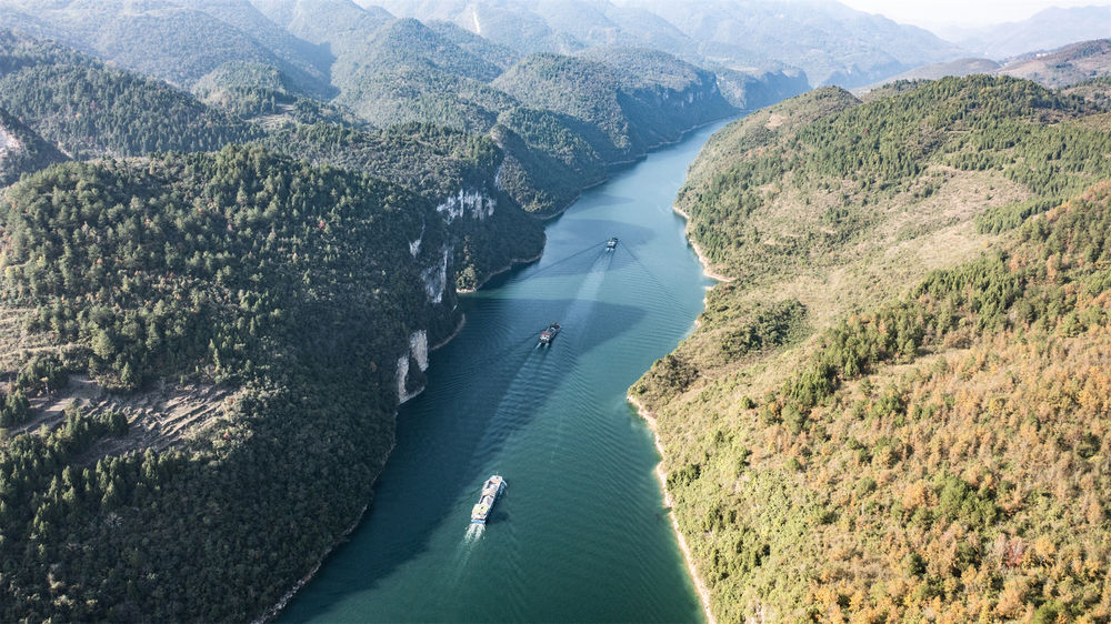 運載磷礦石的貨船沿烏江航道順流航行(2021年11月18日攝,無人機照片)。新華社記者 陶亮 攝