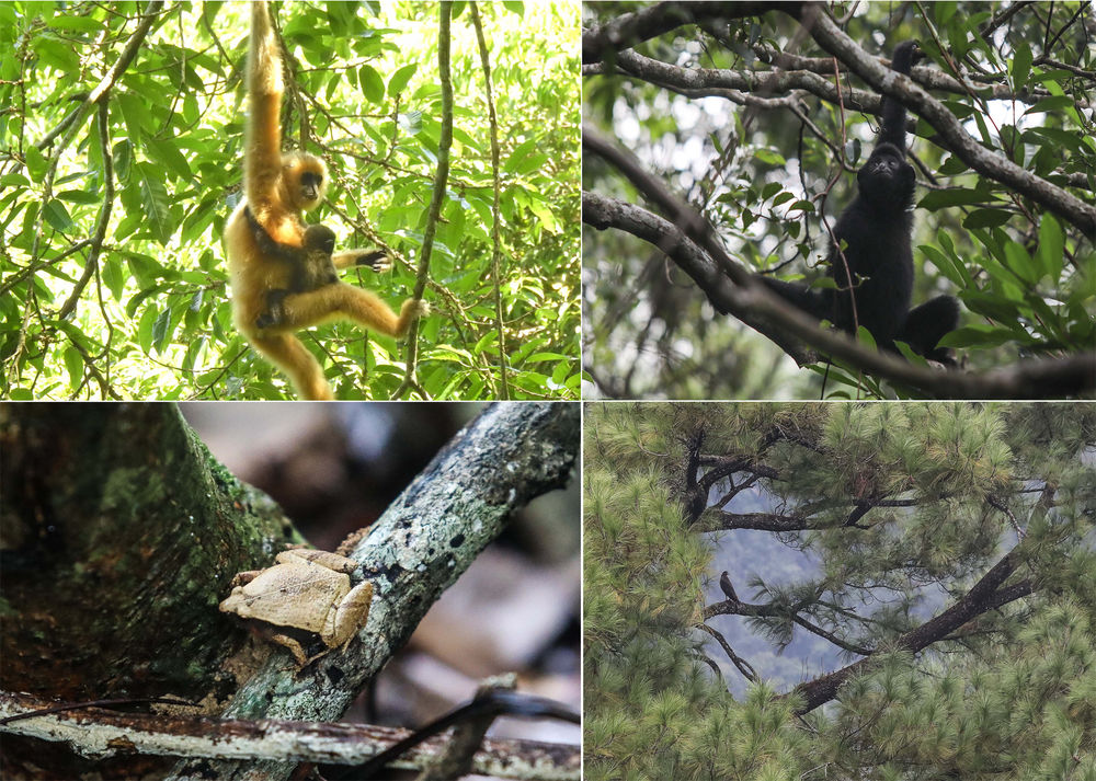 拼版照片:左上圖為2021年5月拍攝的海南長臂猿B群幼猿(海南熱帶雨林國家公園管理局供圖);右上圖為在海南熱帶雨林國家公園體制試點區(qū)霸王嶺自然保護區(qū)內(nèi)拍攝的海南長臂猿(2019年10月25日新華社記者蒲曉旭攝);左下圖為在霸王嶺自然保護區(qū)內(nèi)拍攝的姬蛙(2019年10月26日新華社記者蒲曉旭攝);右下圖為在霸王嶺自然保護區(qū)內(nèi)拍攝的蛇雕(2019年10月26日新華社記者蒲曉旭攝)。新華社發(fā)