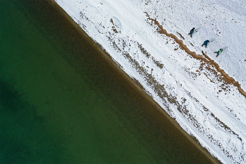 在青海省果洛藏族自治州瑪多縣扎陵湖鄉(xiāng)勒那村,三江源國家公園黃河源園區(qū)生態(tài)管護員在巡護(2021年10月20日攝,無人機照片)。新華社記者 張龍 攝