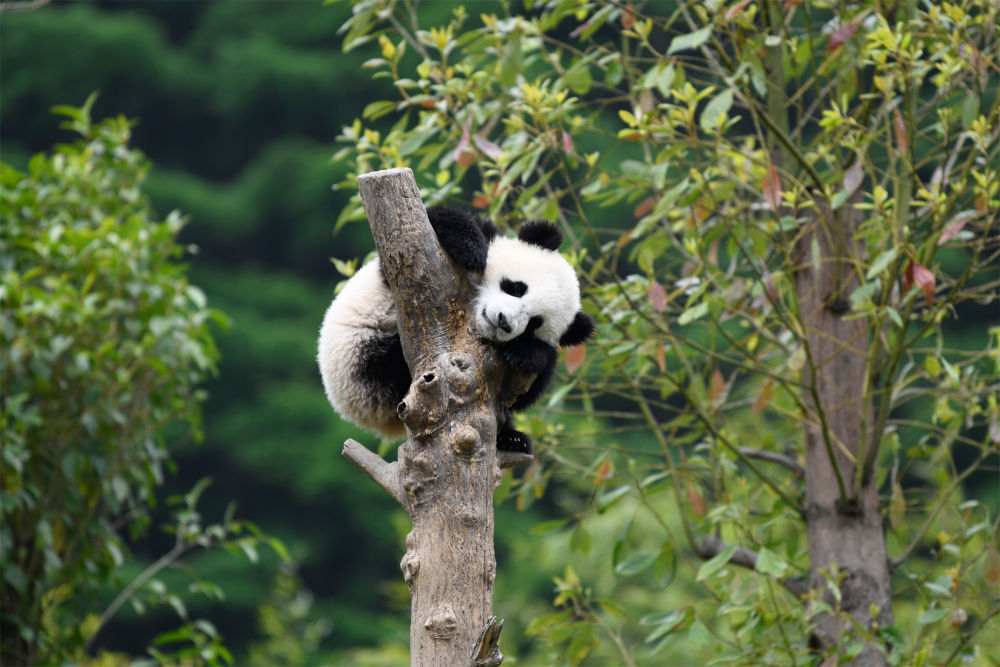 在中國大熊貓保護研究中心臥龍神樹坪基地內(nèi),一只大熊貓在樹上休息(2022年4月24日攝)。新華社記者 胥冰潔 攝