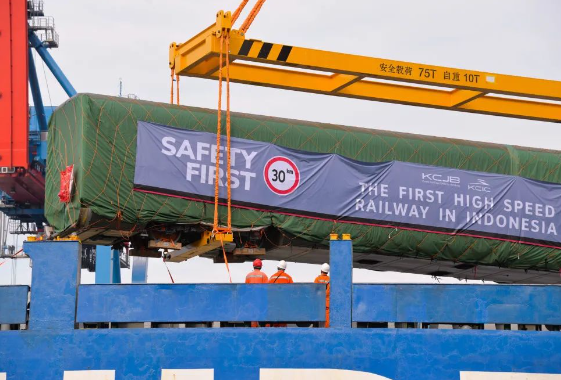 2022年9月,在印度尼西亞雅加達(dá)丹戎不碌港舉行的運(yùn)抵儀式上,雅萬高鐵高速動車組在港口卸船。(圖源:新華社)