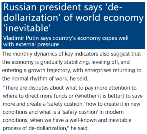 他強(qiáng)調(diào),為確保經(jīng)濟(jì)在當(dāng)前條件下實(shí)現(xiàn)“安全緩沖”,俄羅斯乃至全世界的“去美元化”進(jìn)程已經(jīng)不可避免。