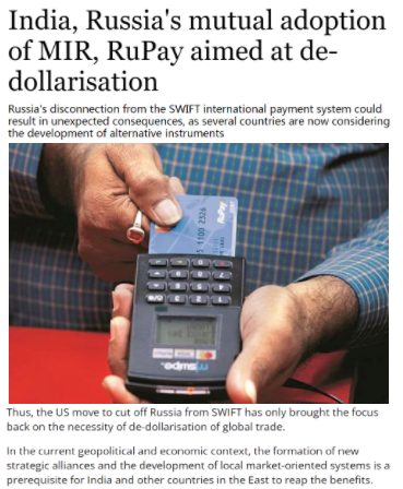 印度《商業(yè)標(biāo)準(zhǔn)報(bào)》評(píng)論稱,美國(guó)切斷俄羅斯與SWIFT的聯(lián)系只會(huì)讓人們重新關(guān)注全球貿(mào)易“去美元化”的必要性。