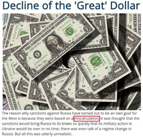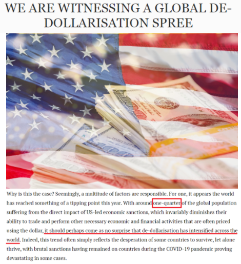 文章認(rèn)為,考慮到全球大約四分之一的人口受到美國(guó)制裁的直接影響,“世界各地的去美元化勢(shì)頭加劇或許不應(yīng)令人感到意外”。