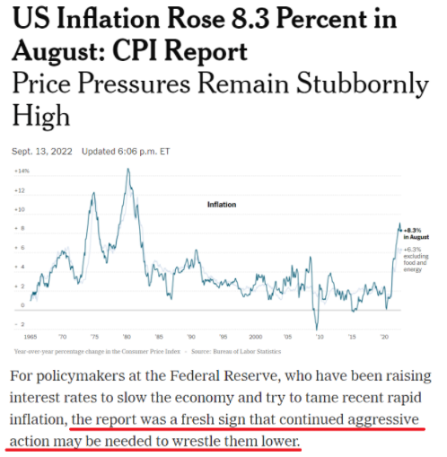 《紐約時(shí)報(bào)》:美國(guó)勞工部公布的最新數(shù)據(jù)顯示,今年8月美國(guó)消費(fèi)者價(jià)格指數(shù)(CPI)同比上漲8.3%。居高不下的通脹率再度強(qiáng)化了市場(chǎng)對(duì)美聯(lián)儲(chǔ)持續(xù)激進(jìn)加息的預(yù)期。