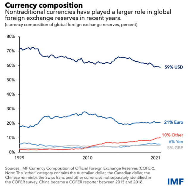 國(guó)際貨幣基金組織(IMF)公布的報(bào)告顯示,截至去年第四季度,美元在全球央行國(guó)際儲(chǔ)備中所占份額已降至58.81%,創(chuàng)下26年以來(lái)的新低。