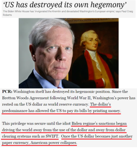 羅伯茨直言,二戰(zhàn)后的美國(guó)霸權(quán)一直依賴于美元的世界儲(chǔ)備貨幣地位。而在拜登政府的制裁開(kāi)始讓世界遠(yuǎn)離美元之后,這種特權(quán)已不再安全。