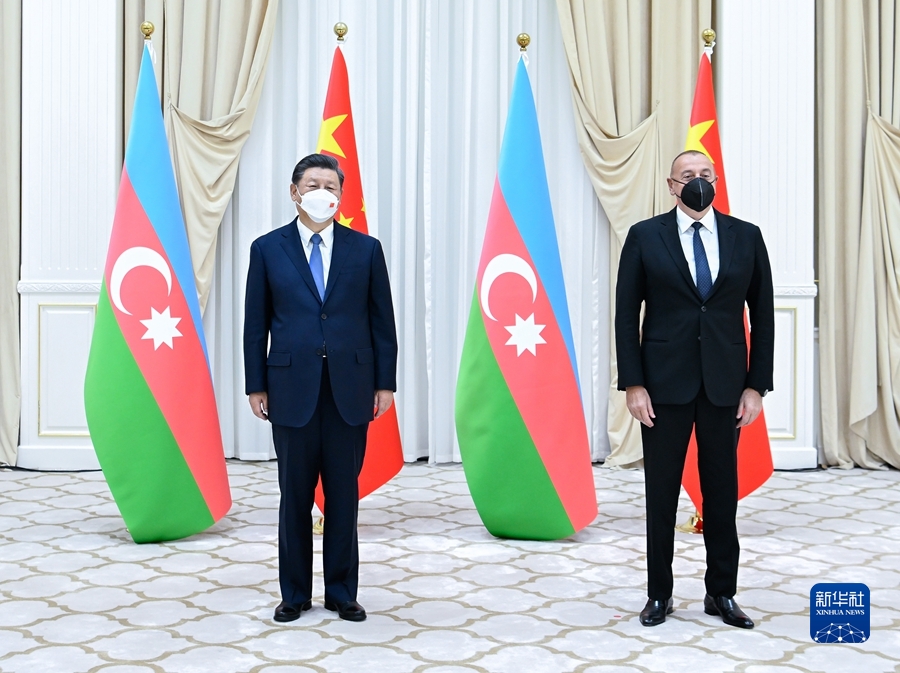 當?shù)貢r間9月15日下午,國家主席習近平在撒馬爾罕國賓館會見阿塞拜疆總統(tǒng)阿利耶夫。新華社記者 翟健嵐 攝