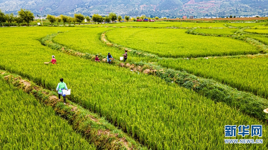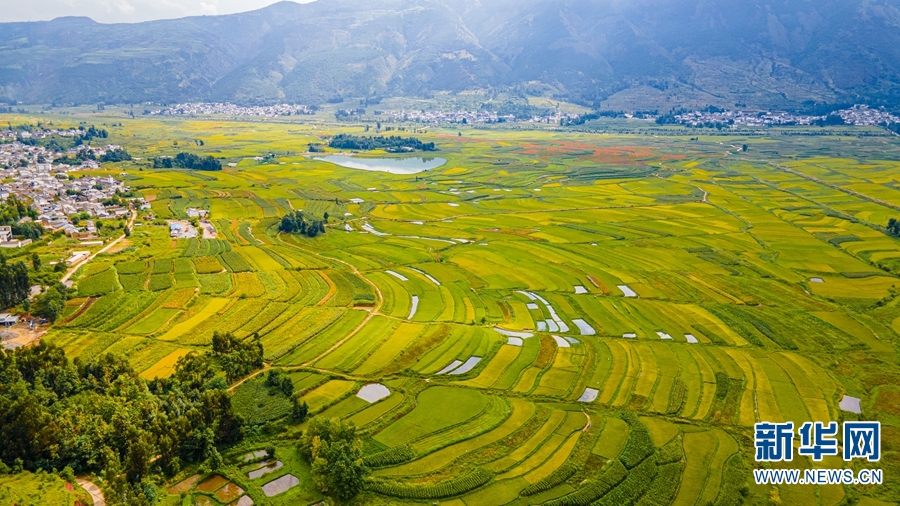 航拍視角下,洱源縣成片的稻田(攝于9月7日)。新華網(wǎng)發(fā)(羅新才/攝)