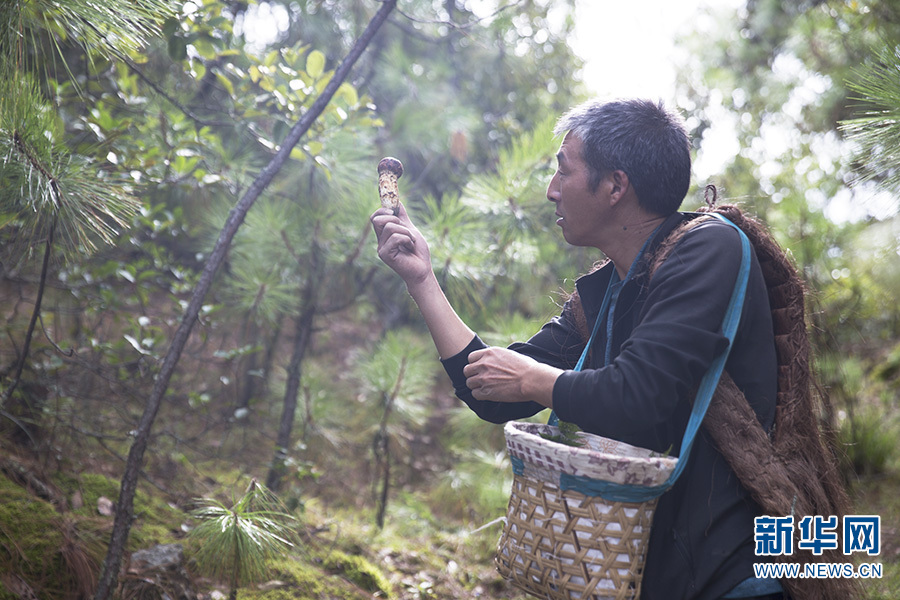 村民胡士平進(jìn)山采菌(攝于8月3日)。新華網(wǎng) 范芳鈺/攝