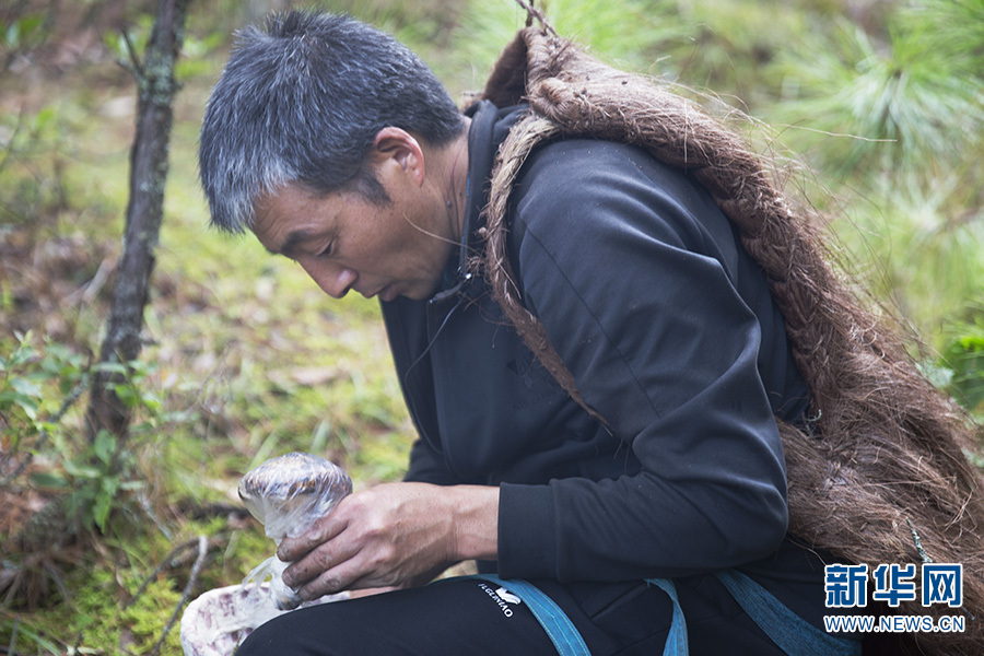 胡士平把菌子包裹好(攝于8月3日)。新華網(wǎng) 范芳鈺/攝