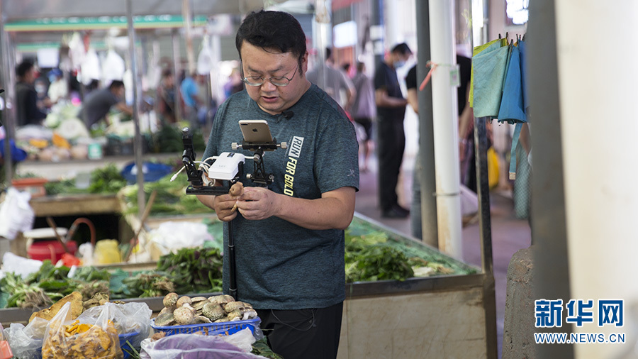 在野生菌交易市場(chǎng),龔兆榮在進(jìn)行直播帶貨(攝于8月2日)。新華網(wǎng) 范芳鈺/攝