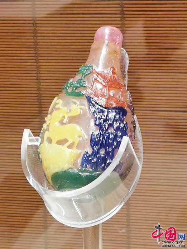 北京藝術(shù)博物館展品:套五色玻璃鶴鹿同春圖鼻煙壺(中國網(wǎng)記者 秦金月 攝影)