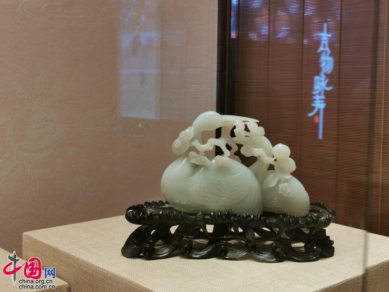 北京藝術(shù)博物館展品:青玉鶴銜桃、靈芝擺件(中國網(wǎng)記者 秦金月 攝影)