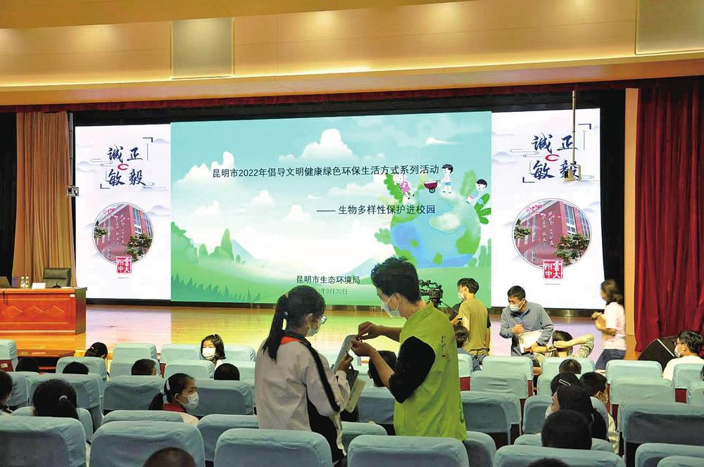 9月20日,昆明市生態(tài)環(huán)境局聯(lián)合云南大學附屬中學,開展昆明市2022年生物多樣性保護宣傳進校園暨生態(tài)環(huán)境保護志愿服務進校園活動,旨在倡導師生積極踐行文明、健康、綠色、環(huán)保的生活方式。