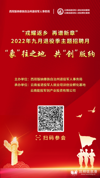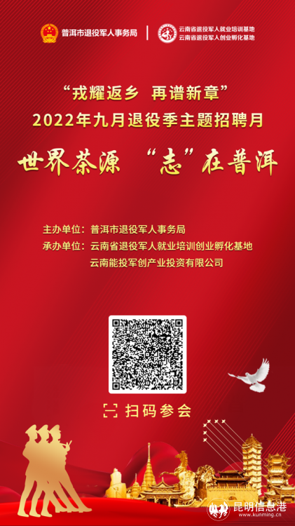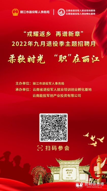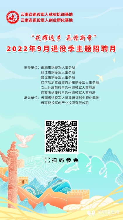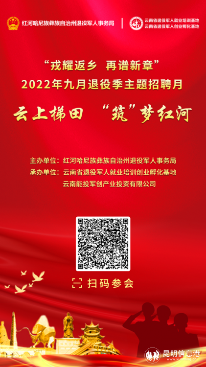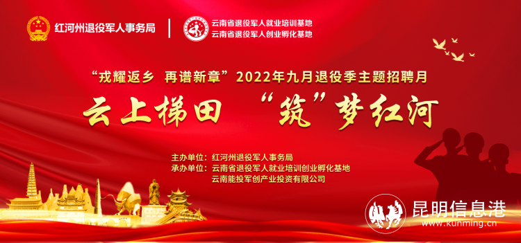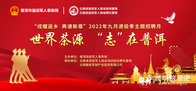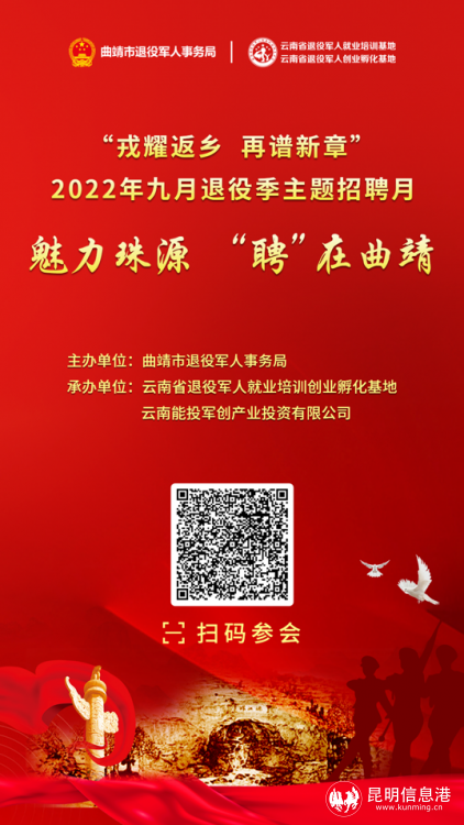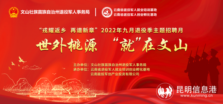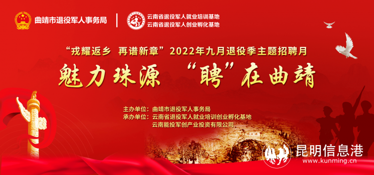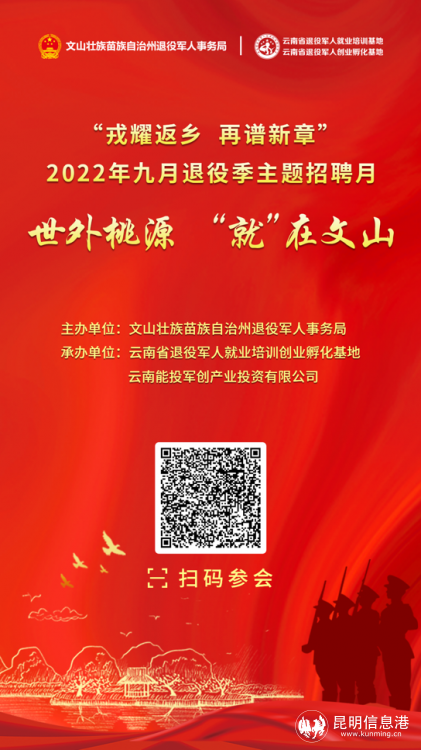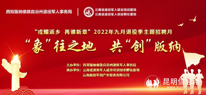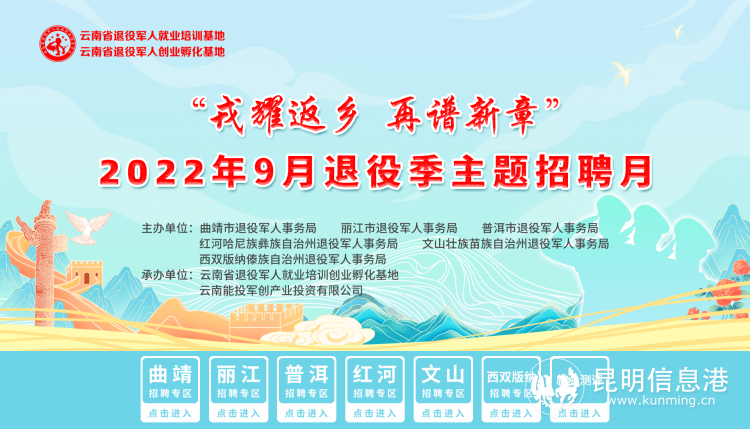 昆明信息港訊 記者勞學(xué)麗 9月21日,由曲靖市退役軍人事務(wù)局、麗江市退役軍人事務(wù)局、普洱市退役軍人事務(wù)局、紅河哈尼族彝族自治州退役軍人事務(wù)局、文山壯族苗族自治州退役軍人事務(wù)局、西雙版納州退役軍人事務(wù)局主辦,云南省退役軍人就業(yè)培訓(xùn)創(chuàng)業(yè)孵化基地、云南能投軍創(chuàng)產(chǎn)業(yè)投資有限公司承辦的2022年“戎耀返鄉(xiāng),再譜新章”9月退役季主題招聘月在線上(www.tzjrzp.com)舉辦至第15天。