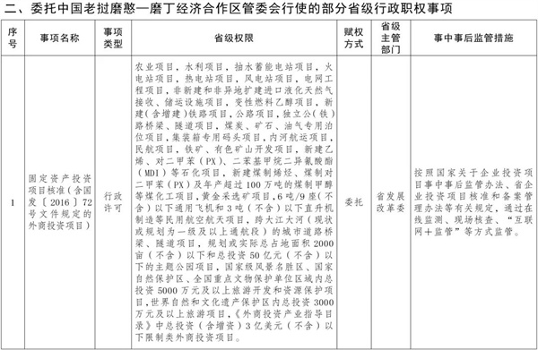 為加快推進(jìn)磨憨國際口岸城市建設(shè),打破體制、機(jī)制和政策壁壘,進(jìn)一步激發(fā)市場(chǎng)活力,賦予中國老撾磨憨—磨丁經(jīng)濟(jì)合作區(qū)更大改革發(fā)展自主權(quán),按照“依法賦權(quán)、能放盡放、能放快放”和“誰審批、誰監(jiān)管,誰主管、誰監(jiān)管”的原則,省人民政府決定,委托昆明市人民政府和中國老撾磨憨—磨丁經(jīng)濟(jì)合作區(qū)管委會(huì)(以下簡(jiǎn)稱經(jīng)合區(qū)管委會(huì))行使30項(xiàng)省級(jí)行政職權(quán)事項(xiàng)(第一批),其中,委托昆明市人民政府行使內(nèi)部審批事項(xiàng)2項(xiàng),委托經(jīng)合區(qū)管委會(huì)行使行政許可事項(xiàng)24項(xiàng)、其他行政權(quán)力事項(xiàng)2項(xiàng)、內(nèi)部審批事項(xiàng)2項(xiàng)。