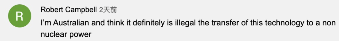 澳大利亞網(wǎng)友Robert Campbell表示:“我是澳大利亞人。我認為將這個技術(shù)轉(zhuǎn)讓給一個無核國家絕對是不合法的。”