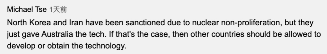 英語網(wǎng)友Michael Tse:“朝鮮和伊朗因不擴散核武器條約而受到制裁,但美國和英國把技術(shù)給了澳大利亞。如果可以這么做的話,那么其他國家應(yīng)該被允許開發(fā)或獲得核技術(shù)?!?/p>
