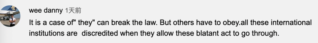英語網(wǎng)友wee danny:“這又是一個雙標(biāo)案例。‘某些國家’可以違反,但其他人必須服從。所有允許這種明目張膽的雙標(biāo)行為的國際機構(gòu),都將名譽掃地?!?/p>