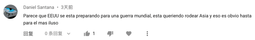 西班牙語網(wǎng)友丹尼爾:“美國正在籌備一場世界大戰(zhàn),企圖圍堵亞洲,這已是昭然若揭?!?/p>