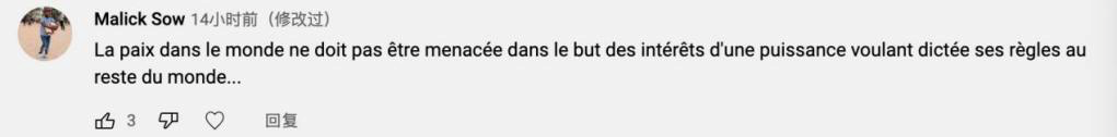 法語網(wǎng)友Malick Sow:“不能為了一個想要將其規(guī)則強加給世界其他地區(qū)的大國的利益而威脅到整個世界的和平?!薄斑@起核轉(zhuǎn)讓事件就是一個完美的例子,美國隨時準(zhǔn)備一切行動,甚至能為了經(jīng)濟利益打擊自己的盟友。”