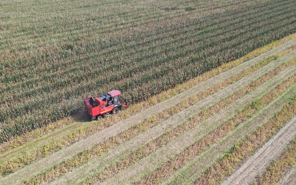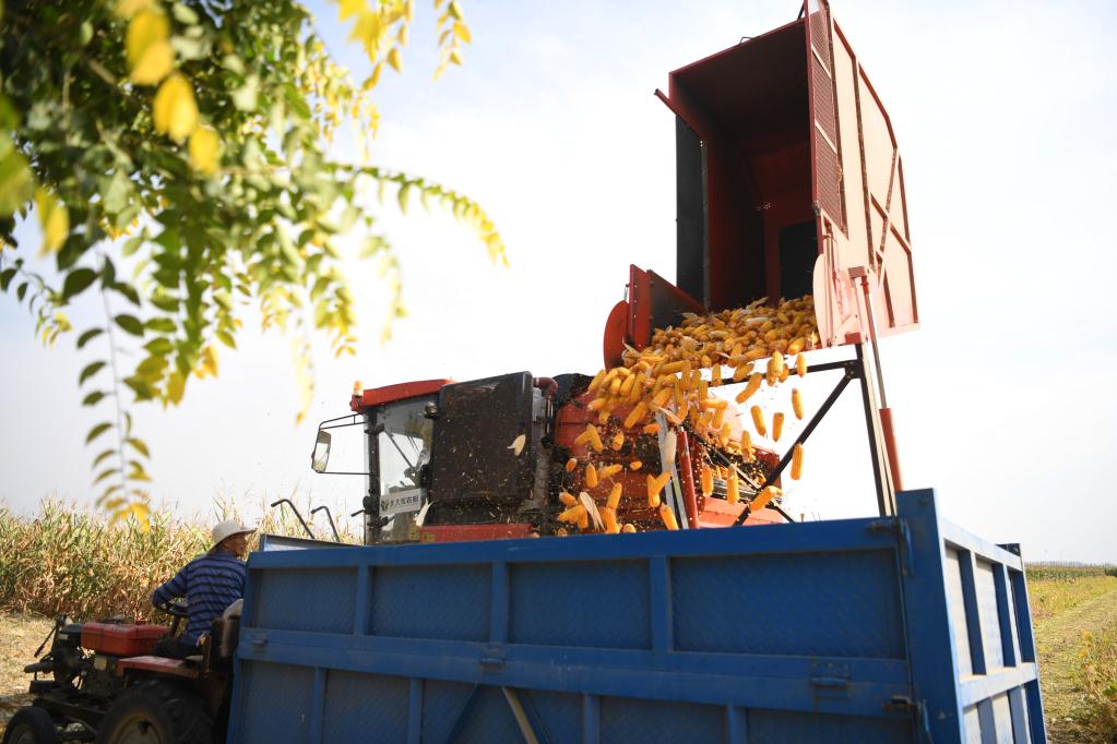 9月22日,玉米收割機(jī)將收獲的玉米倒入小四輪拖拉機(jī)車斗內(nèi)。新華社記者張浩然/攝